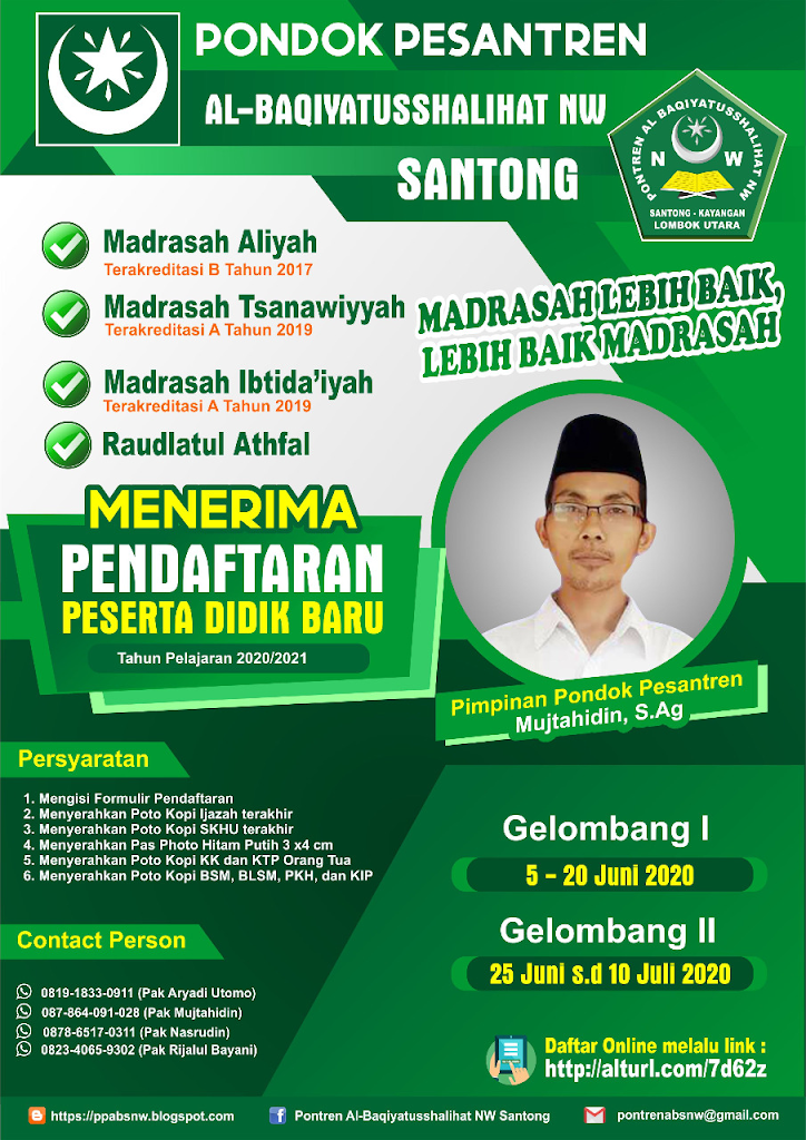Pondok Pesantren Al-Baqiyatusshalihat NW Santong menerima peserta didik baru Tahun Pelajaran 2022/2023 jenjang pendidikan sebagai berikut: a. Raudhatul Atfal (RA)